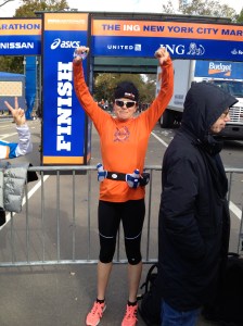 There was even people cheering the runners on and mini-aid stations. If NY’ers want their marathon – they will get it! Ironically we ended up in at a bar watching the Bears game. The next day I did two loops of the park and also saw several other runners doing multiple loops. There was definitely a sort of camaraderie on the streets of New York between people who looked like runners or were wearing their orange marathon shirt. I wore mine for my run on Monday. I am sure for those runners who had trained hard for this particular race they felt like they needed to do it. Other runners went to Staten Island to help with the relief effort. It isn’t confirmed but I believe we have guaranteed entry into it next year but I can’t do it because I will be doing the Arizona IM 2 weeks later. Hopefully they will extend the entry to 2014 :). I just want to run the New York marathon, some day and make this finish line picture real.