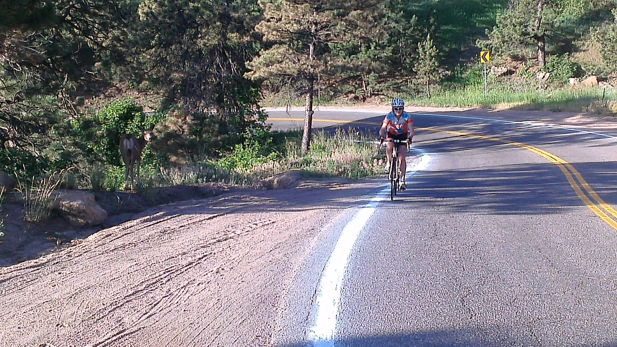 The next ride took me up four mile canyon. This one I did on my mountain bike, a bit easier with the mountain bike gears. It was about 3,700 feet of climbing in 2 hours. On the way up there was a teeny tiny town where I stopped t o take a few snaps. I also caught a deer staring me down and I thought for sure this was a relative of the deer I killed and he was going to charge me!